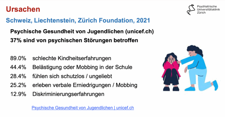 Sage und schreibe 37% der Jugendlichen in der Schweiz und in Liechtenstein sind von psychischen Störungen betroffen, und die Statistik zeigt, dass es dafür fast nie eine einzige Ursache gibt, sondern dass es um das Zusammenspiel vieler Faktoren: Familie, Schule, Peers, Medien, Krisen und individueller Veranlagung geht.