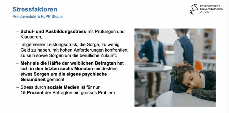 Schul- und allgemeiner Leistungsdruck: In Befragungen nennen Jugendliche als Hauptstressoren Prüfungen und die hohen schulischen Anforderungen, die Unsicherheit über die eigene berufliche Zukunft und finanzielle Sorgen. Mehr als die Hälfte der weiblichen Befragten hat sich in den letzten sechs Monaten Sorgen um die eigene psychische Gesundheit gemacht: