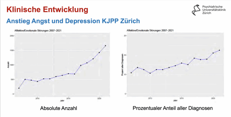 Besonders markant ist der Anstieg stressbedingter Störungen seit Mitte der 2000er-Jahre. In der Kinder- und Jugendpsychiatrie Zürich zeigt sich ein deutlicher Zuwachs an Angst- und Depressionsdiagnosen – sowohl absolut als auch anteilig.