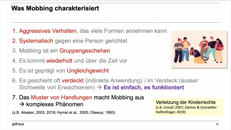 Mobbing ist ein Machtungleichgewicht. Beim Mobbing stehen Kinder nicht auf Augenhöhe. Das betroffene Kind ist in einer schwächeren Position – vielleicht, weil es ruhiger, sensibler, ängstlicher oder einfach „anders“ ist. Die MobberInnen haben dagegen oft Unterstützung durch eine Gruppe oder nutzen gezielt Schwächen aus.