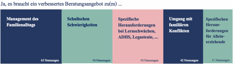 Mehr als jede Dritte Familie unserer Umfrage wünscht sich Beratung zum «Management des Familienalltags», etwa ein Drittel «zu schulischen Schwierigkeiten und zu den spezifischen Herausforderungen bei Lernschwächen, ADHS, Legasthenie. Rund ein Viertel wählten als «Umgang mit familiären Konflikten» in etwa jede(r) Fünfte «zu den spezifischen Herausforderungen für Alleinerziehende» als erwünschtes Beratungsthema.