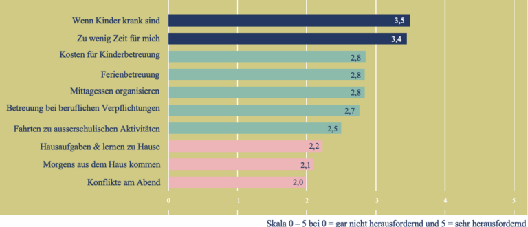 Doch auch verschiedene Themen rund um die Kinderbetreuung (die Kosten, die Betreuung in den Schulferien, da die Ferientage der Kinder die Anzahl der Urlaubstage der Eltern um ein Vielfaches übersteigen und die Betreuung von Kindern bei beruflichen Verpflichtungen ausserhalb gängiger Betreuungszeiten) beschäftigen viele Familien und machen es Eltern schwer, ihren beruflichen Verpflichtungen nachzukommen.